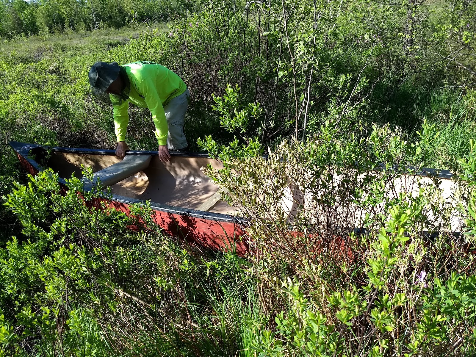 | Inch by inch we shuffle the canoe through the brush along the river's edge. |