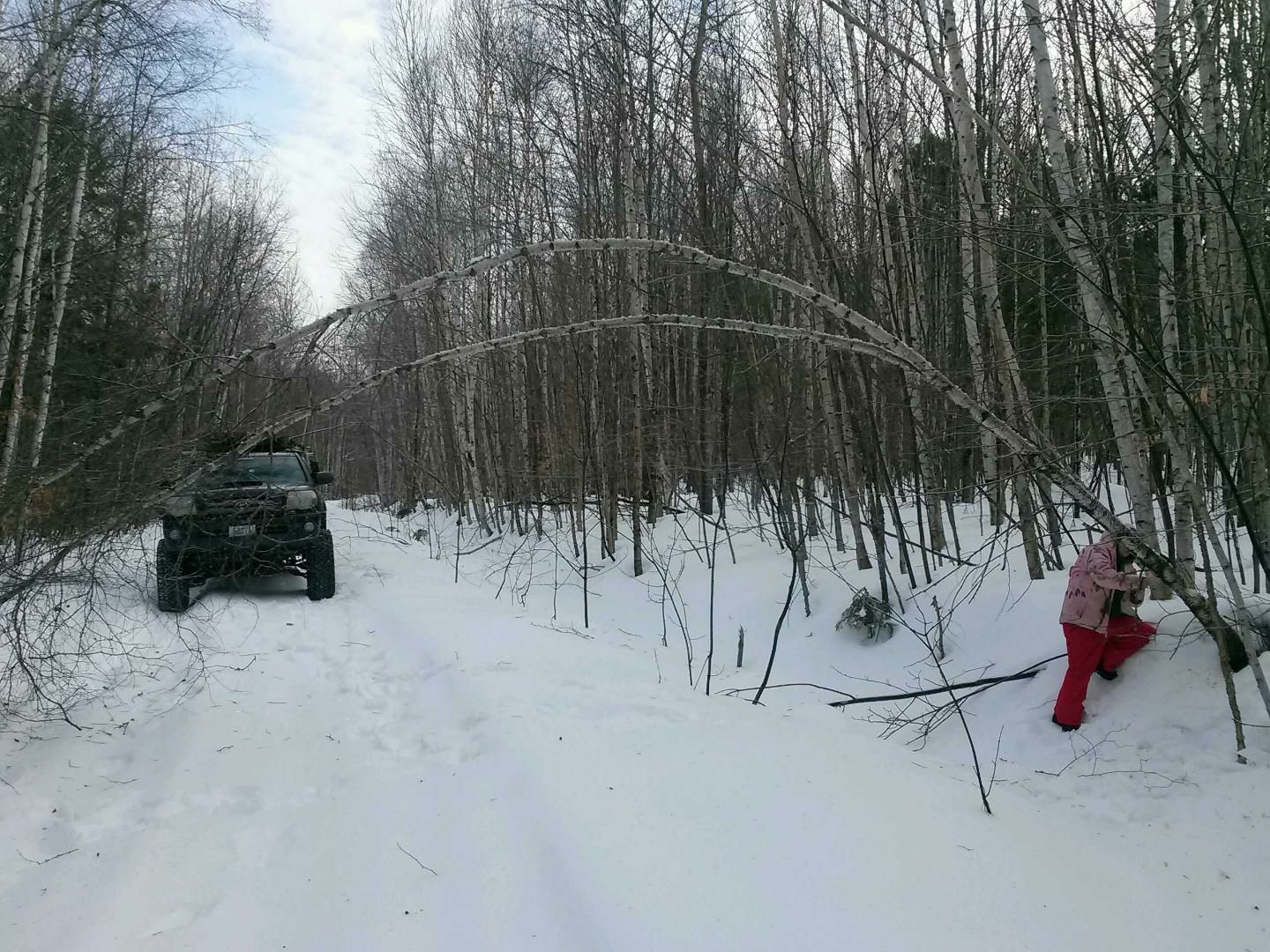 It had snowed a couple more FEET since we were last at camp. The snow up in Piscataquis County is no joke - the average annual snowfall of our town up there is 93" (7.75 feet) while the average annual snowfall of the entire US is 26".Getting stuck in the snow was a real possibility. An off-road recovery/tow would probably cost hundreds, if not more, so was therefore out of the question. One of the neighbors we met said they'd gladly help us out in a bind with their bulldozer if need be, and though duly noted and appreciated, we'd prefer to figure out a way to manage by ourselves. That being said, we creeped and crawled and spun our way cautiously down the trail, hoping that our previously made tire tracks from the other visits would aid us in staying on the trail - incredibly tricky, white-knuckle driving conditions.
